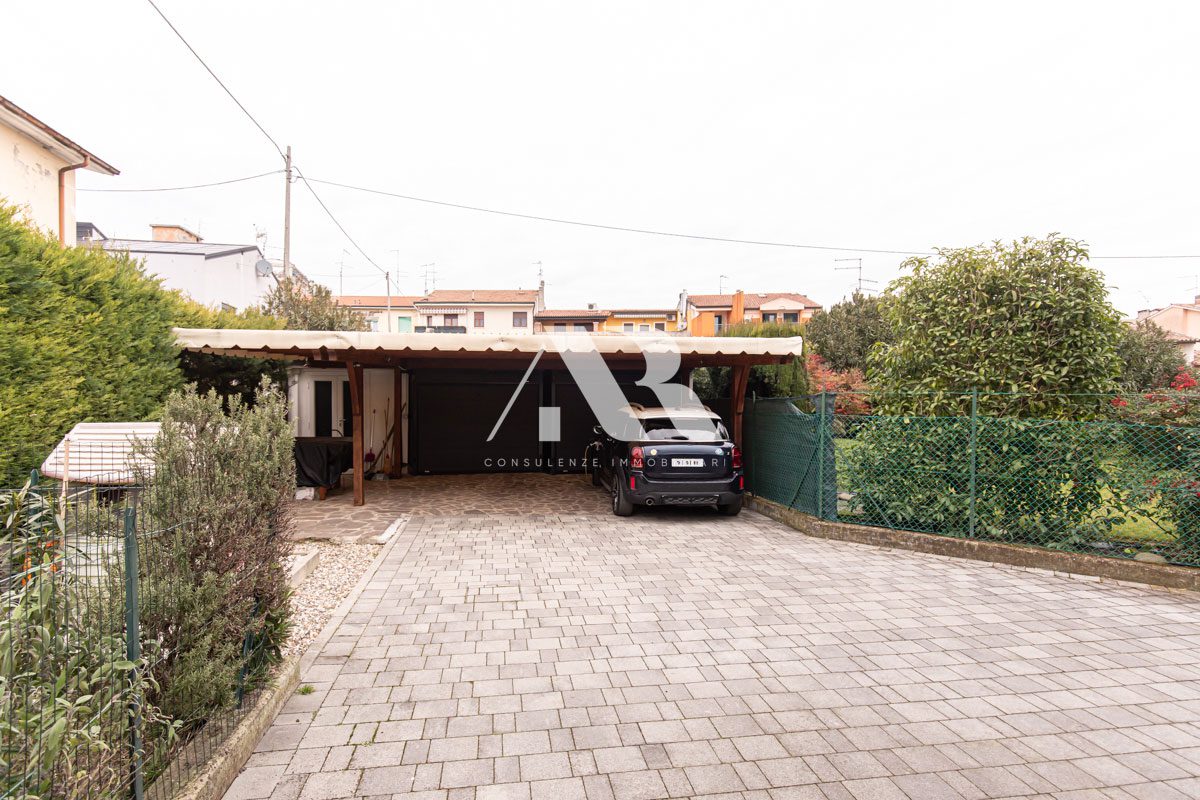 Un ampio e comodo ingresso carraio, in comune con l’altra unità immobiliare che costituisce questa villa bifamiliare, conduce al garage e posto auto privati, posti entrambi al piano terra.